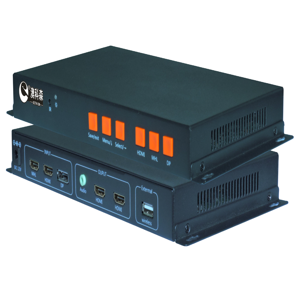 支持1路HDMI2.0、1路HDMI1.4、1路DP信號輸入,信號切換可以通過遙控器、按鍵、或者通過輸入信號自動識別功能。