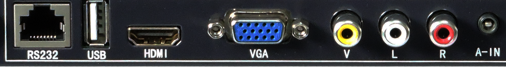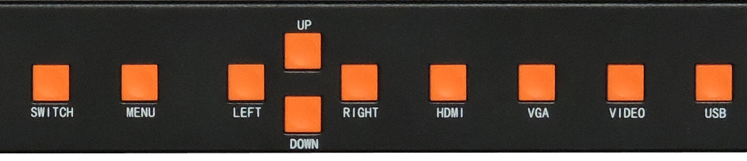 可支持1路復合視頻、1路VGA、1路HDMI、1路USB總計四路信號輸入,其中HDMI和USB信號接口自帶音頻解碼功能,復合視頻和和VGA信號外加相應綁定音頻接口,所有輸入視頻信號均可實現(xiàn)與音頻同步輸出切換,接口圖如下: