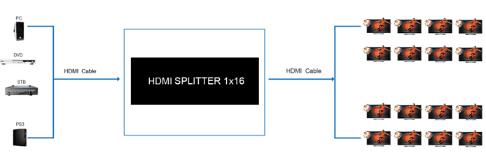 1進16出HDMI分配器可以把1個高清信號源連接到16個高清顯示終端。它可以很容易地將1路高清信號源所產(chǎn)生的高清信號分配到16臺支持高清信號的顯示器或者投影機上。另外,把它接在一根HDMI線的信號輸出端時,可對HDMI信號進行放大。此HDMI分配器可以支持所的分辨率可達1920X1080/60HZ。